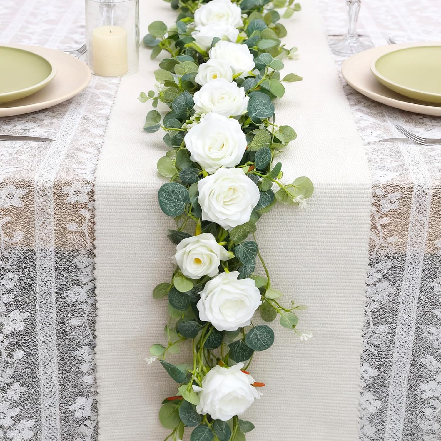 6FT Artificial Eucalyptus Garland with 14 Fake White Rose Flowers - Floral Greenery Decoration Vine for Wedding Centerpieces, Table Runner, Backdrop, Arch Wall Decor,Indoor/Outdoor (1 PCS)