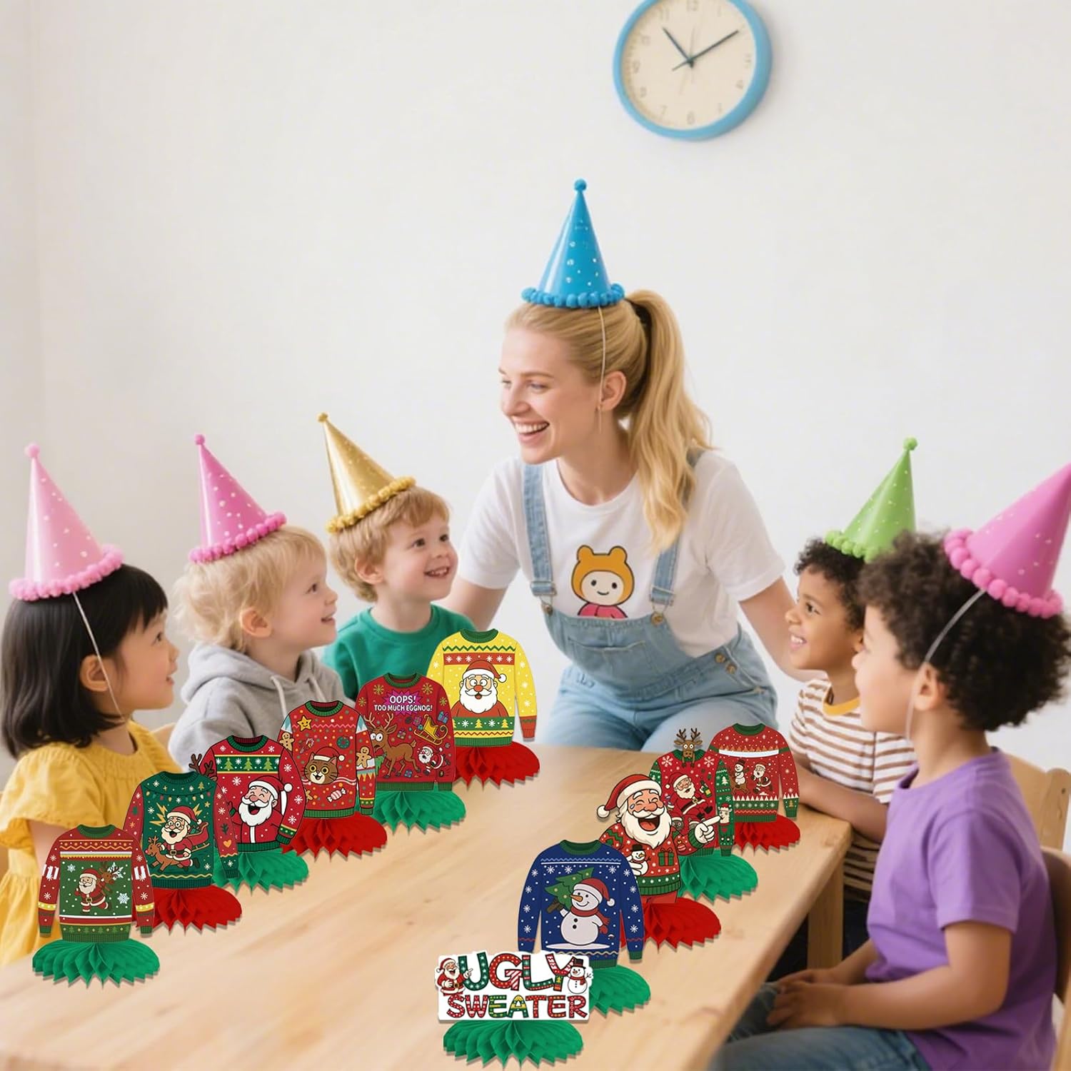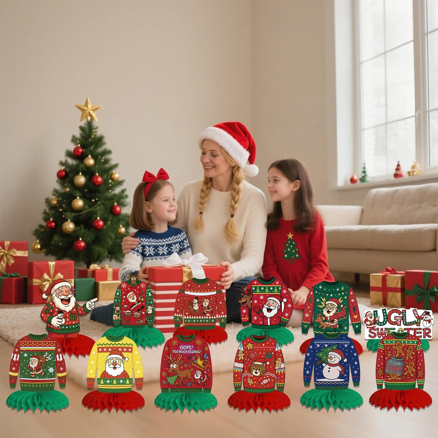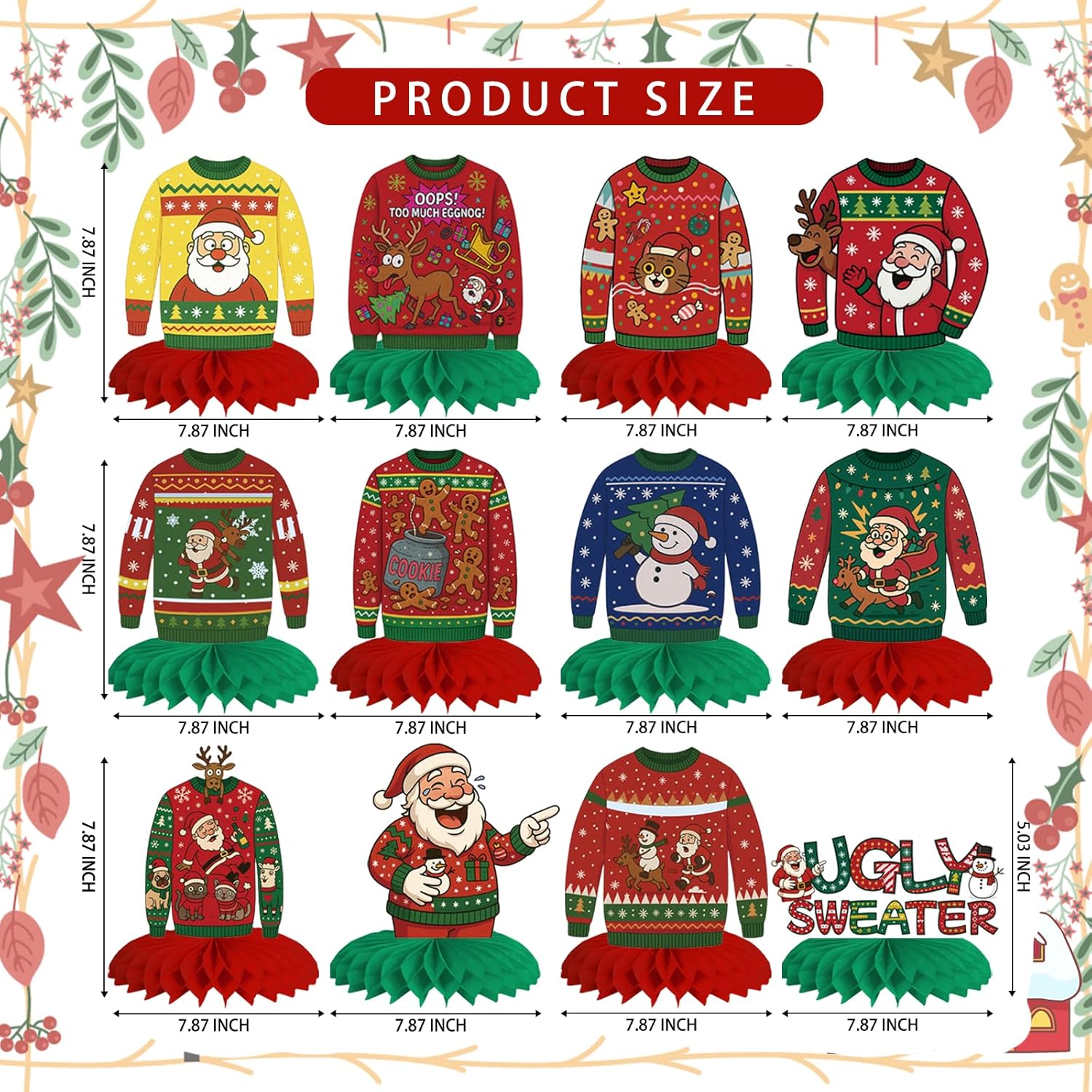- Ugly Sweater Party Decorations:Our Ugly Sweaters Honeycomb Centerpieces set includes 12 pack Christmas Party centerpieces, Contains various styles of ugly sweaters, with patterns featuring Christmas elements such as Santa Claus, reindeer, snowman, gingerbread man, etc.