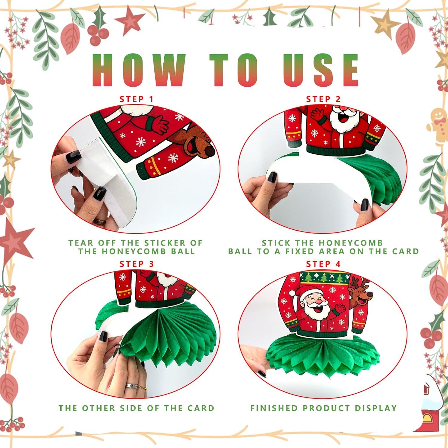 - Easy Assembly:These Christmas Ugly Sweater Party Decorations are pre folded and pre cut, you just need to unfold them, tear off the sticker of the sweater honeycomb balls, stick onto the card;The standing card can be easily inserted into the base, saving you valuable time when preparing for your event.