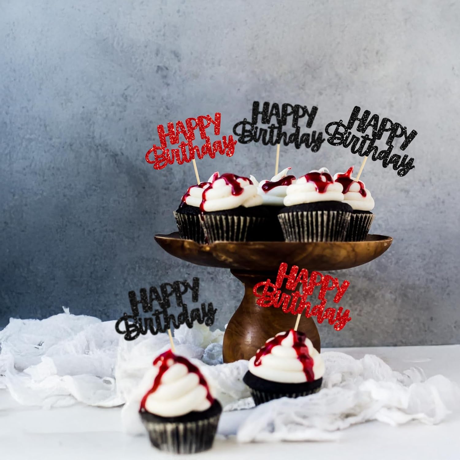Gyufise 24Pcs Happy Birthday Cupcake Toppers Glitter Birthday Cupcake Food Picks for Celebrating Happy Halloween Theme Party Cake Decorations Supplies Black Red