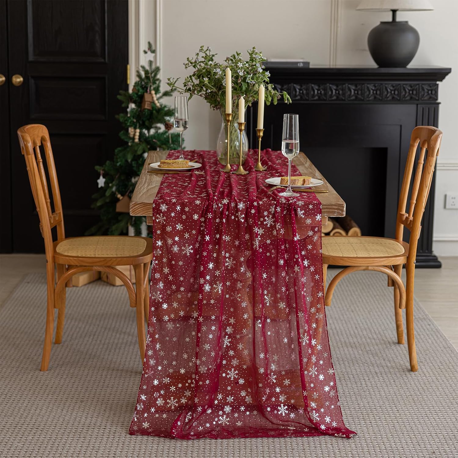 - Foil-Printed snowflakes shimmering metallic design catches the light beautifully.Versatile decor works for christmas, weddings, parties, and home styling.120" length fits standard dining tables with elegant drape . sheer tulle fabric lightweight yet durable, won’t wrinkle easily