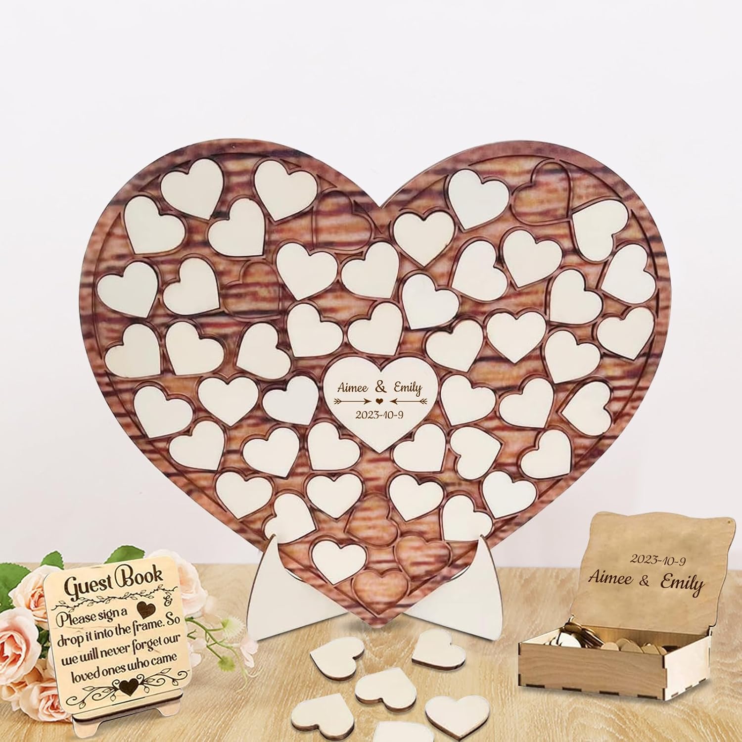 - Personalized Wedding Guest Book: This customizable wedding guest book allows for personalized names and dates. The couple can have their names and wedding date engraved on the book, transforming it into a special wedding keepsake. Guests write their names or well-wishes on heart-shaped wooden pieces before placing them inside the book. Each wooden piece carries the guest's heartfelt message, capturing a special moment from the couple's wedding day.