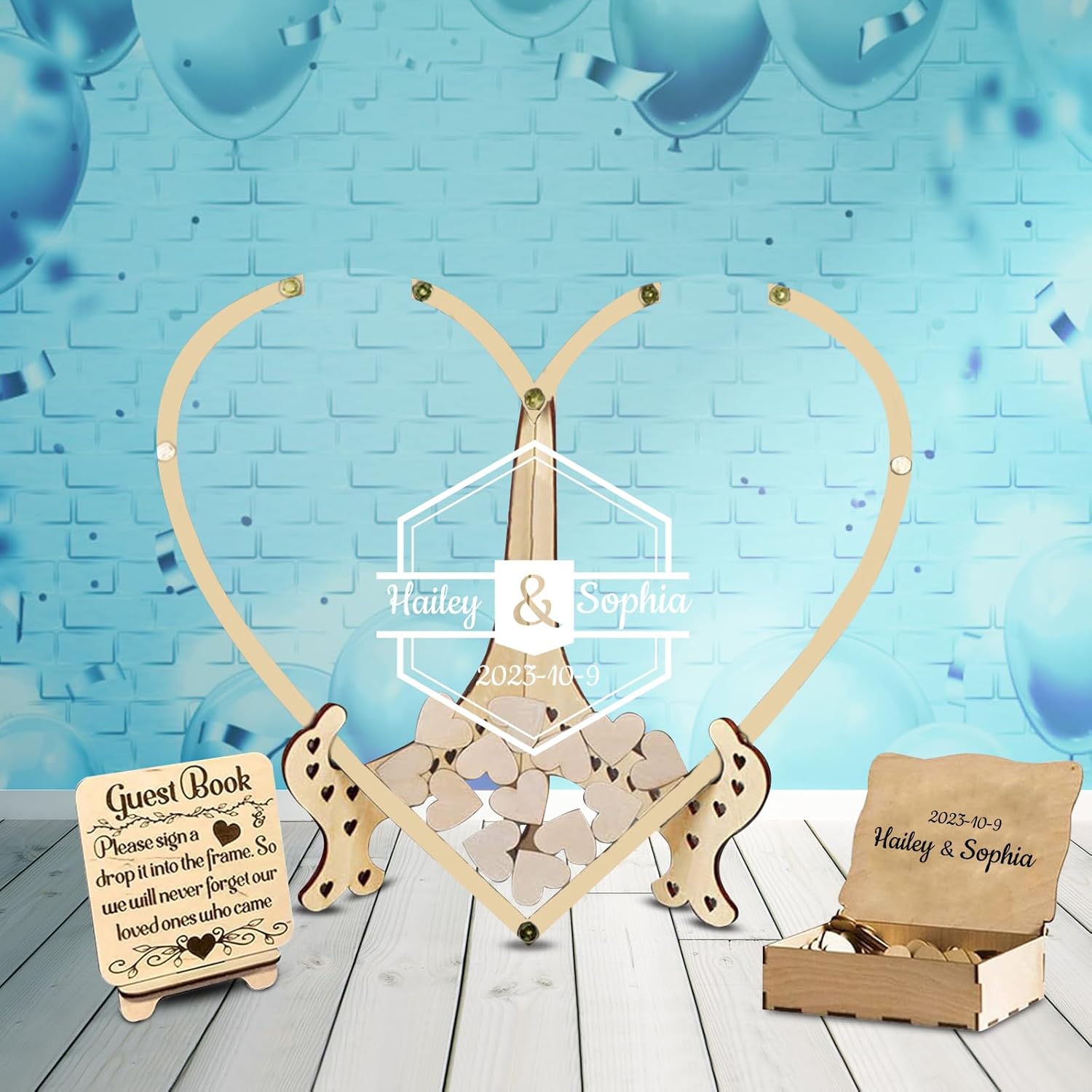 - Personalized Wedding Guest Book: This customizable wedding guest book allows for personalized names and dates. The couple can have their names and wedding date engraved on the book, transforming it into a special wedding keepsake. Guests write their names or well-wishes on heart-shaped wooden pieces before placing them inside the book. Each wooden piece carries the guest's heartfelt message, capturing a special moment from the couple's wedding day.