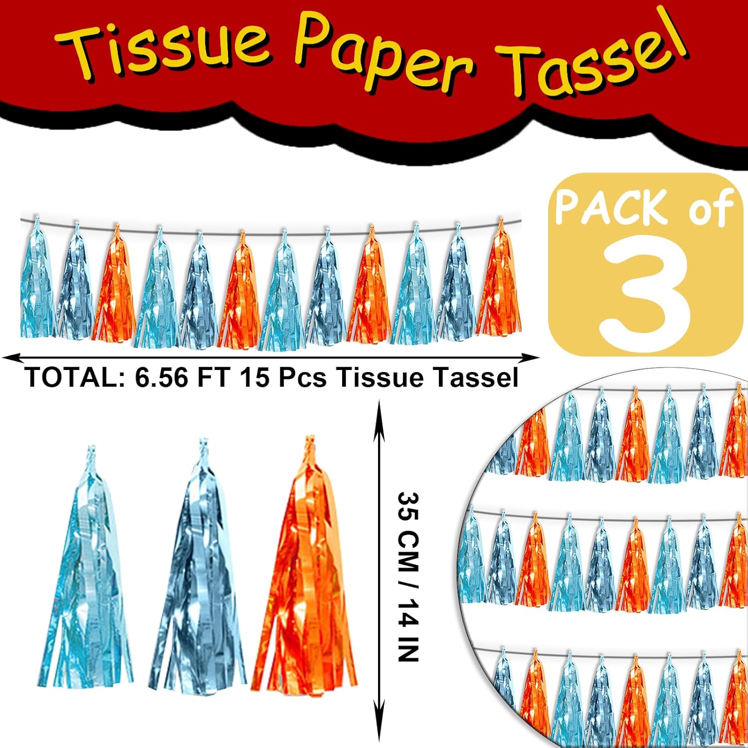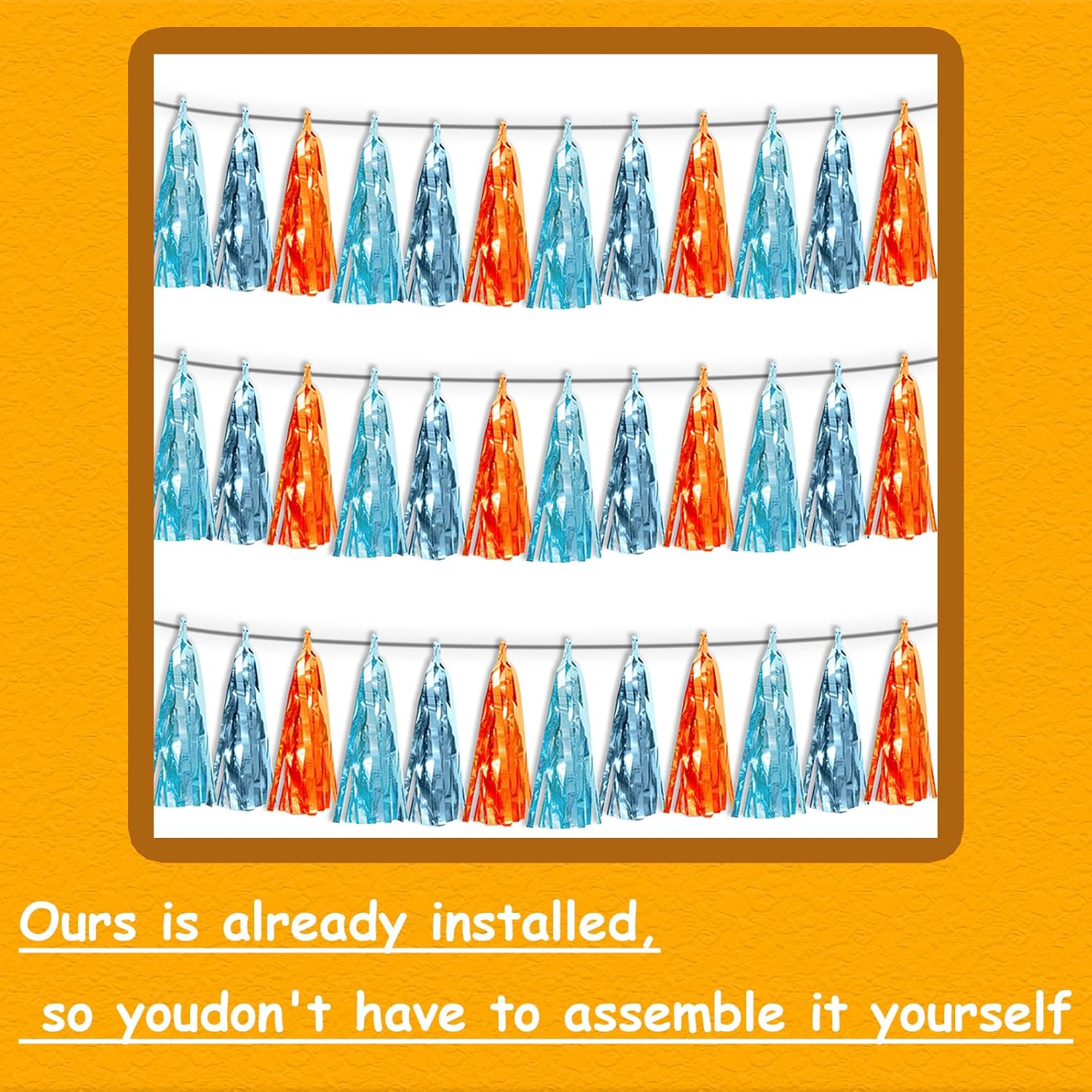 - 【Package Includes】The total length of the Lake Blue Light Blue Orange birthday tassels banner is 30 feet, divided into 3 strips, each 10 feet long. Each banner contains 15 tassels, and each tassel measures 14 inches, for birthday decorations many occasions uitable for Patriotic display, Homecoming Float, Christmas Float, ecorative metal trailers, graduation floats etc