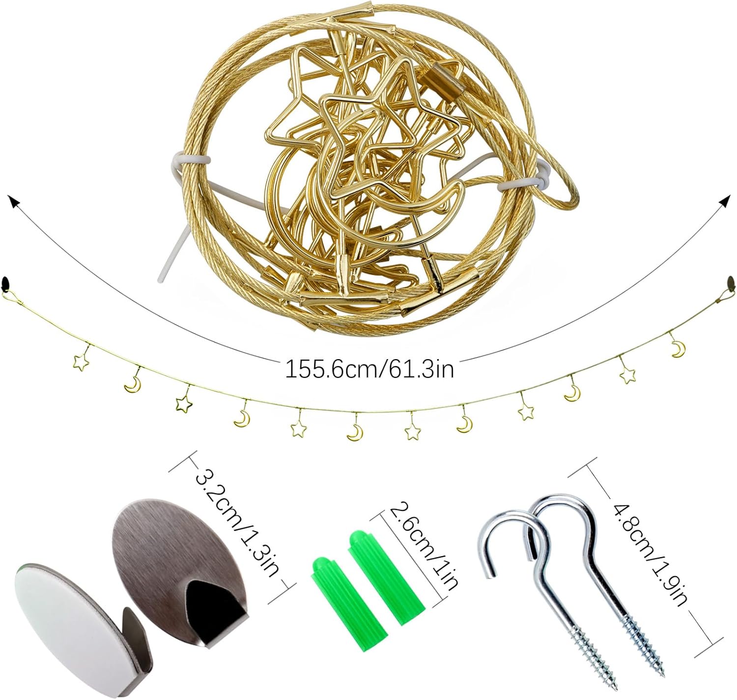 2 Pack Chain Photo Clip Hanging Photo Display Wall Photo Display Metal Photo String with 12 Clips Wall-Mounted Picture Holder for Hanging Painting Family Photos Artworks(Gold-Star and Moon)