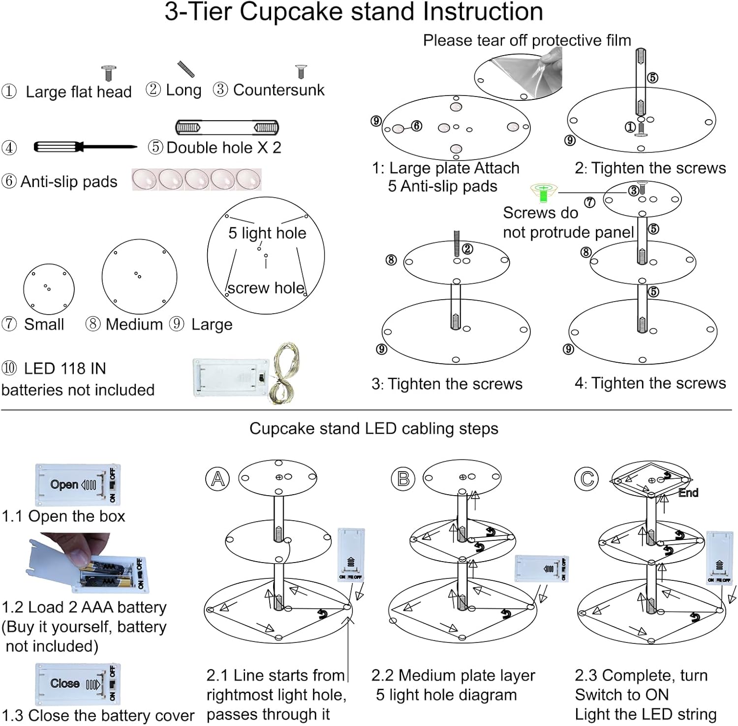 - What You Get: Cupcake tower include 1 X 3 tier round cupcake stand, 1 X Phillips Screwdriver, 1 X 10 feet LED Light (2 AAA battery not included), 1 X Specification