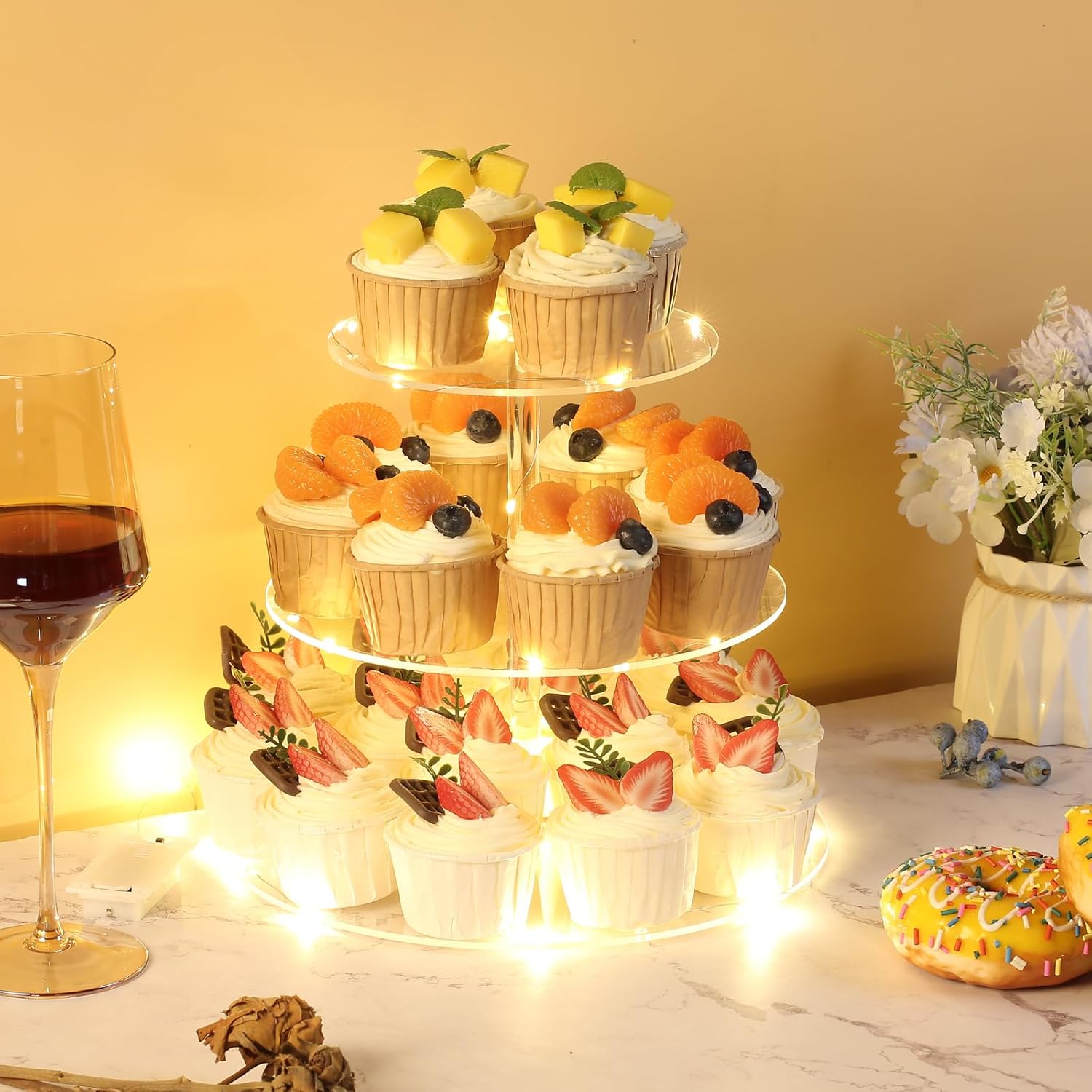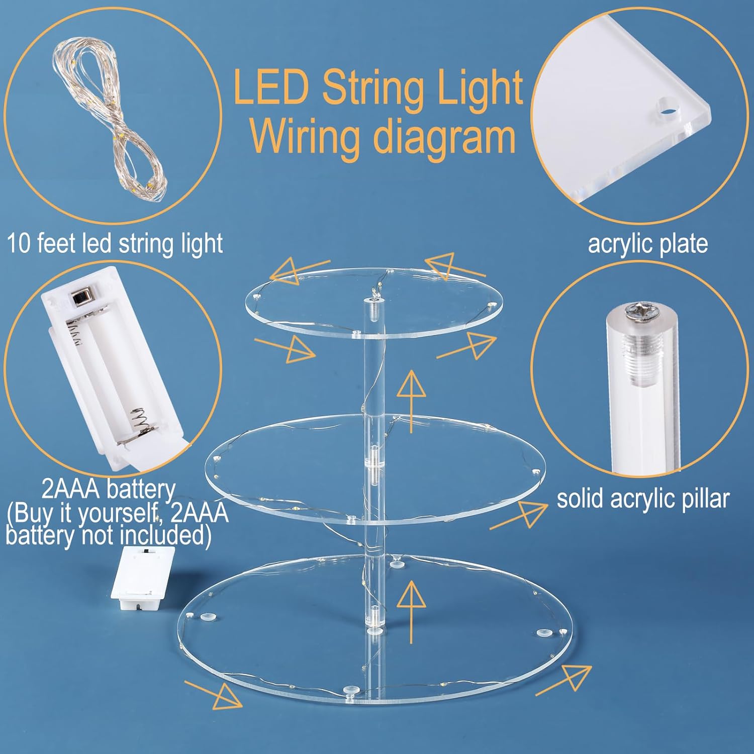 - Premium Materials: 3 Tier dessert table display set is made up of acrylic with a height of 8.8IN. There are 5 silicone pads at the bottom of the cupcake holder to prevent slipping. In addition, there are 10-foot led lights with holes in the edge of the cupcake stand, and you can wind strings of lights to decorate the cupcake display