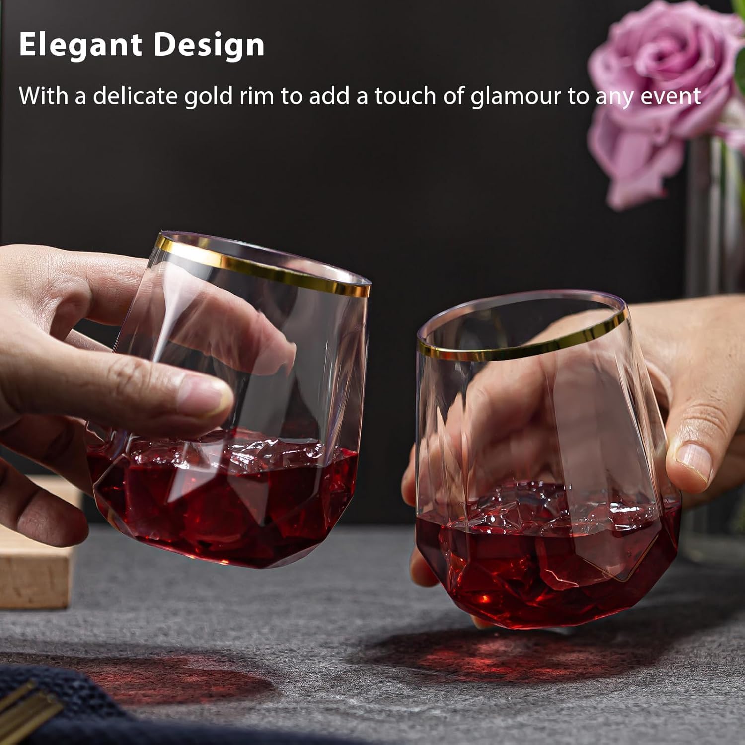 40 count Diamond Unbreakable Stemless Plastic Wine Champagne Whiskey Glasses Elegant Durable Disposable Indoor Outdoor Home office wedding bars 12 Ounce (Classic Old Fashioned Gold Rim)
