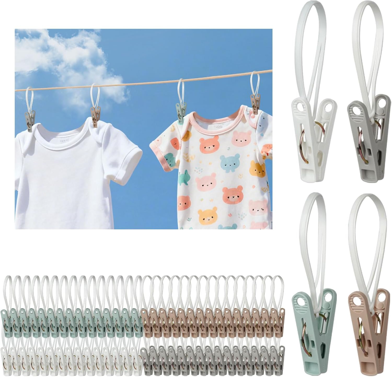 60 Pack Clothes Pins with Plastic Rope,Multi-Purpose Clips for Hanging,Windproof Plastic Clothespins for Hanging Baby Clothes,Socks,Hats, Pants, Bras, Underwears,Towels,Photos,White, Brown, Gray, Gree