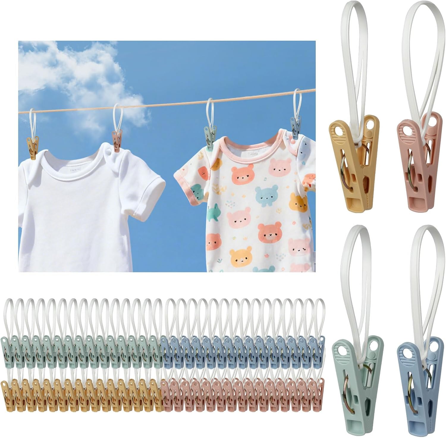 60 Pack Clothes Pins with Plastic Rope,Multi-Purpose Clips for Hanging,Windproof Plastic Clothespins for Hanging Baby Clothes,Socks,Hats, Pants,Bras,Underwears,Towels,Photos,Blue,Green, Yellow,Orange