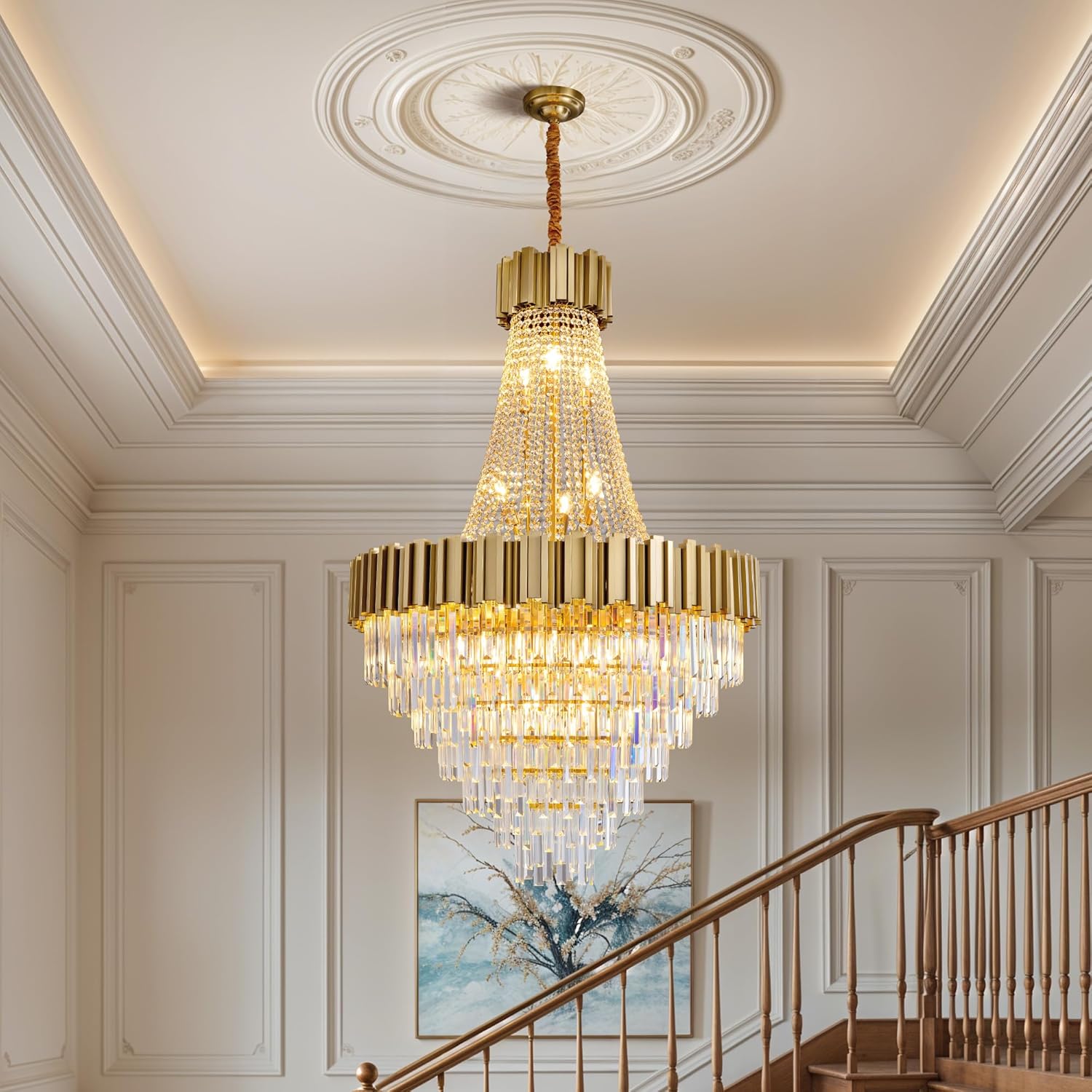 - 【Luxury High Ceiling Chandelier】This stunning modern chandelier is crafted with premium gold frame and 100% top K9 transparent crystals that exude a diamond-like brilliance. With 420 sparkling crystals adds brilliance and sophistication, each crystal refracts light beautifully, creating a dazzling, luxurious atmosphere for your home.