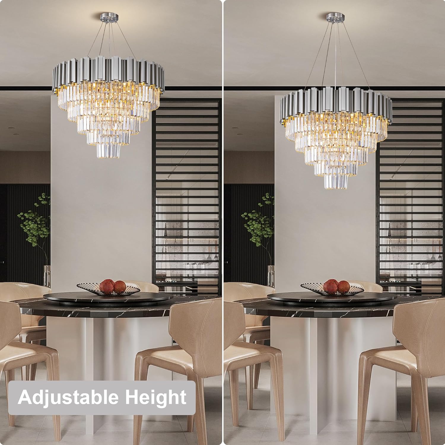 - 【Chandelier Dimensions】Overall size: 27.56"W x 21.26"H; Comes with a 79" adjustable cable that you can easily shorten or extend to perfectly fit your ceiling height and room style. Weight: 24LB; The high-quality aluminum base easily supports the weight of the crystals. Please check and confirm the ceiling's load-bearing capacity before installation.