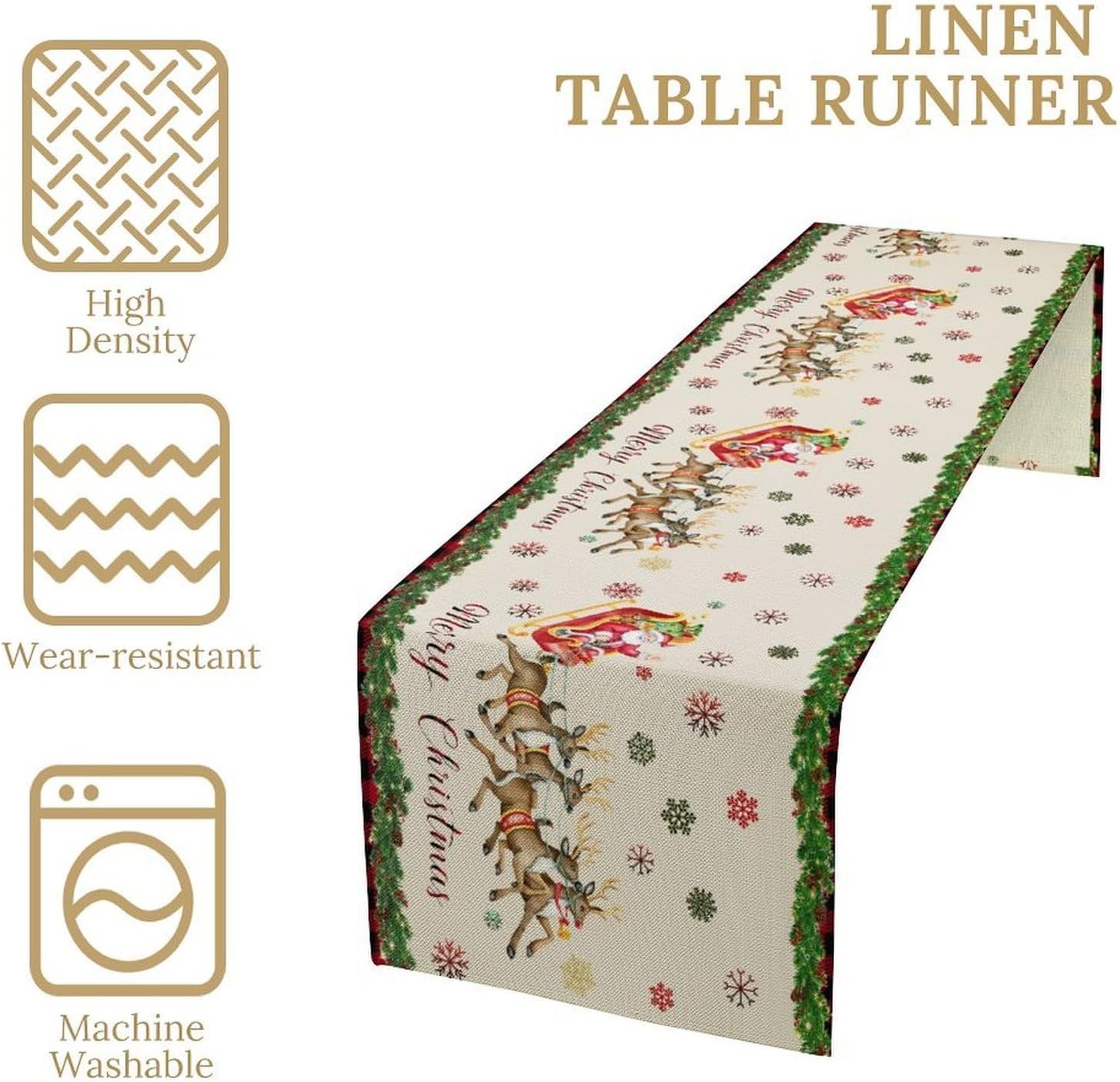 Christmas Table Runner,Xmas Deer Cute Santa Claus Red Plaid Pattern Printed Tablecloth Burlap for Hotel Indoors Outdoor Dining Room Kitchen Home Decor,W13X L90 in