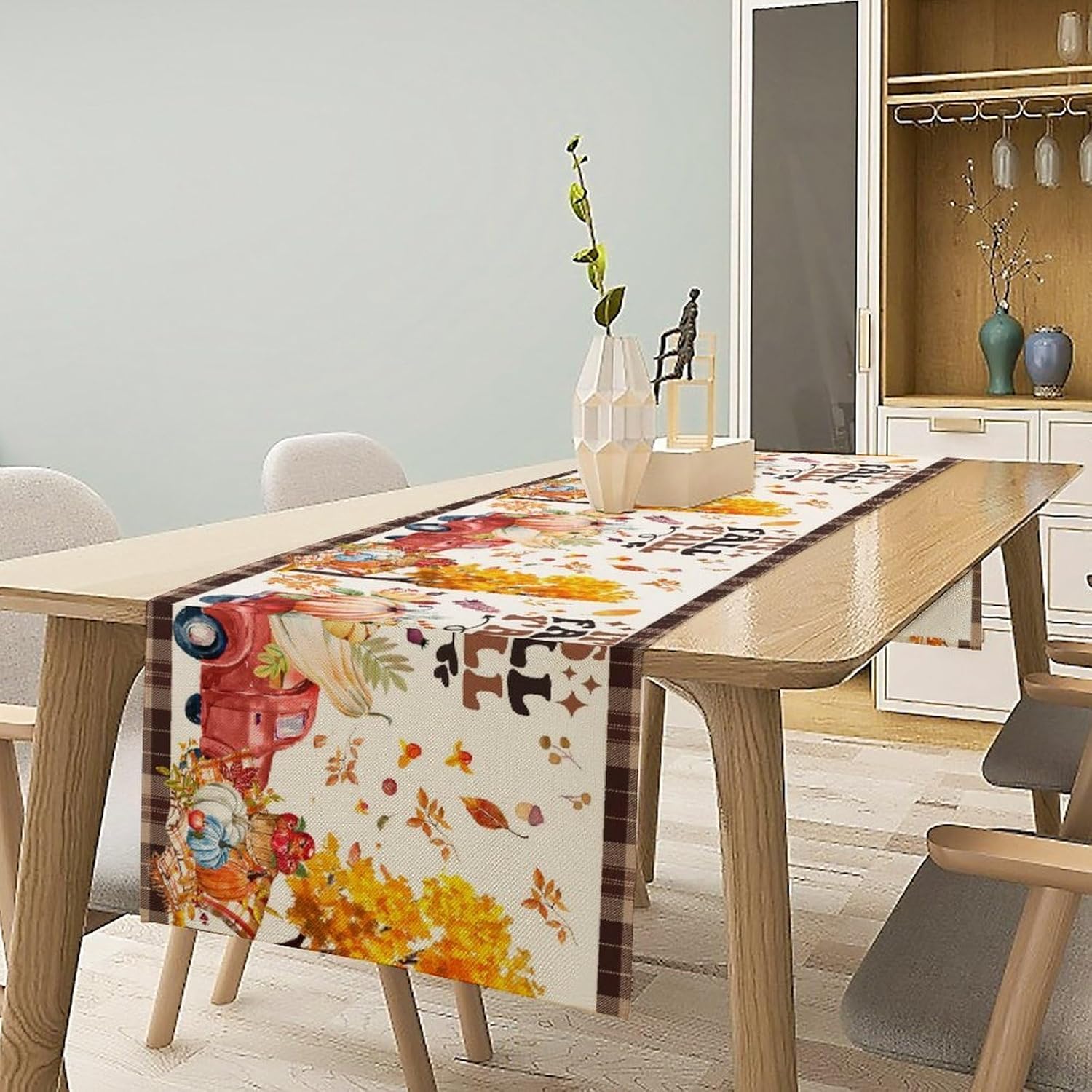 Fall Pumpkin Table Runner,Rustic Maple Yellow Leaf Trees Truncks Brown Plaid Tablecloth Burlap for Hotel Indoors Outdoor Dining Room Kitchen Home Decor,W13X L70 in