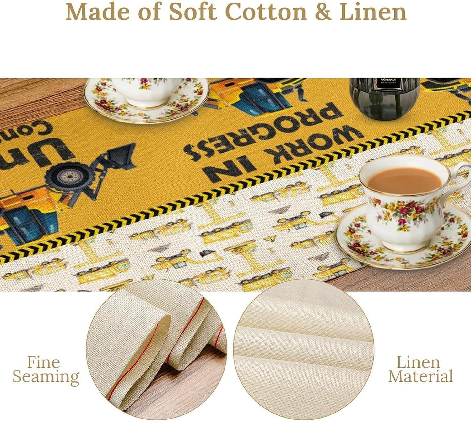 Cartoon Car Table Runner,Boys Kids Construction Vehicles Truck Yellow Print Tablecloth Burlap for Hotel Indoors Outdoor Dining Room Kitchen Home Decor,W13X L60 in